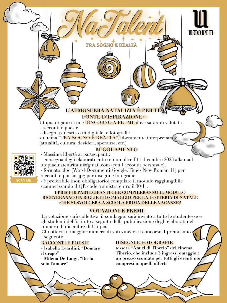 Si informano gli studenti che la redazione del giornalino d’istituto “Utopia” organizza il concorso artistico-letterario a premi “NaTalent”, per le categorie di elaborati di “racconti e poesie” e “disegni e fotografie”