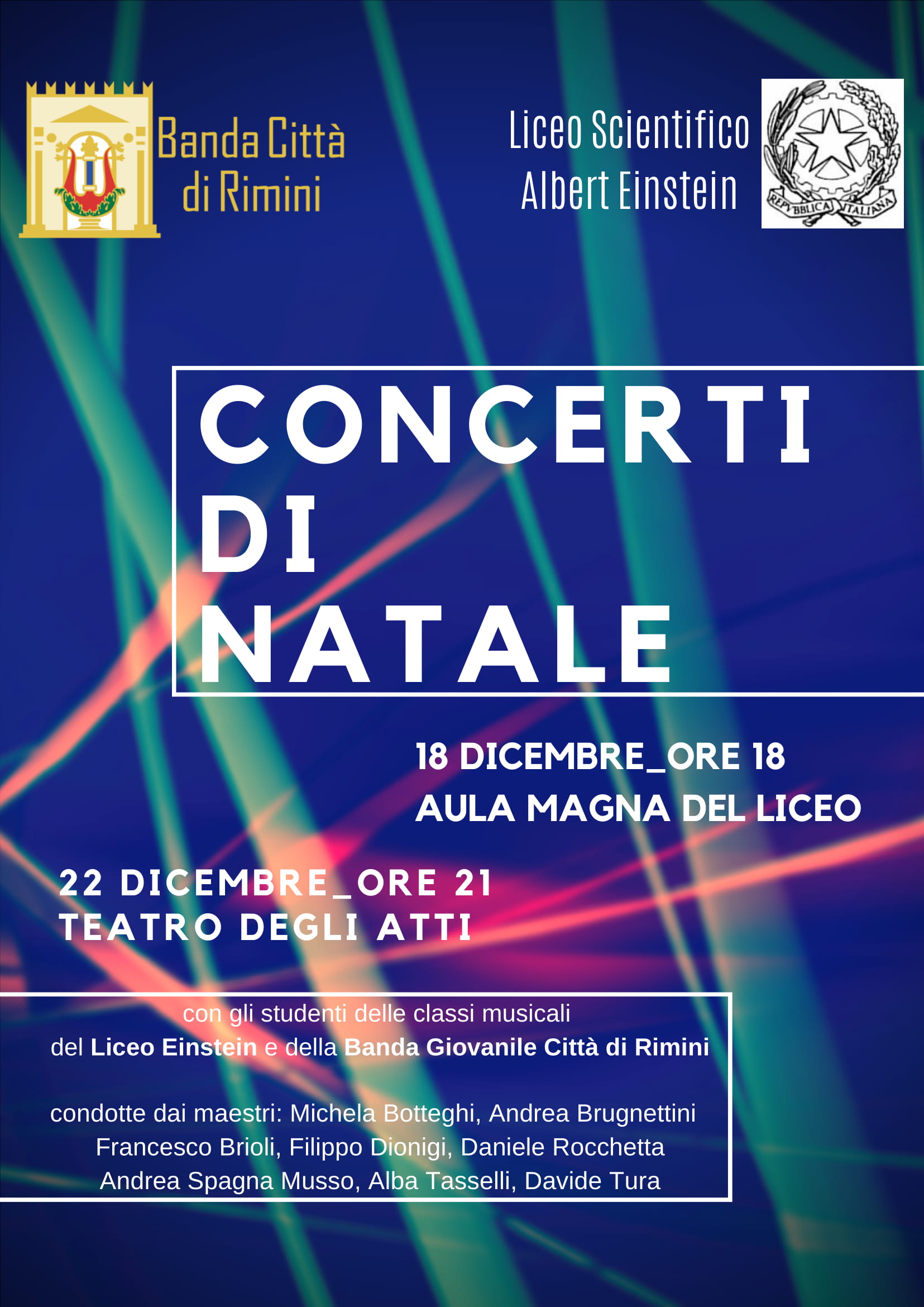 Doppio appuntamento, quest’anno, con il tradizionale concerto di Natale, e doppia formazione orchestrale: in scena, accanto all’Einstein Music Orchestra del Liceo Einstein e al Coro dello Spazio bianco diretti dai Maestri Davide Tura e Filippo Dionigi, la Banda Giovanile Città di Rimini guidata dal M° Andrea Brugnettini.