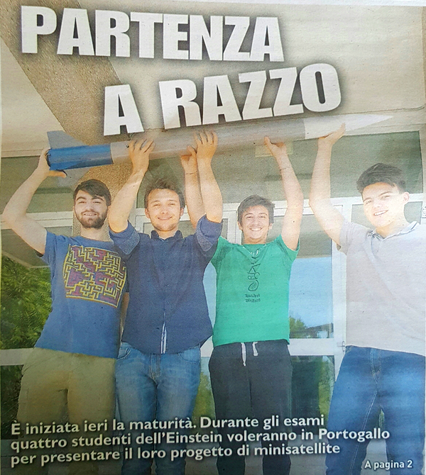 E’ un piccolo razzo, interamente costruito con i mattoncini Lego,  il minisatellite costruito dal team del Liceo Einstein che in questi giorni, a Lisbona, tenterà  di scalare le vette della competizione europea Cansat per aggiudicarsene il podio. Nemmeno la maturità  ha infatti fermato Francesco de Cecio, Andrea Serafini, Francesco Falcone e Paolo Matteoni che, coordinati dal prof. Filippi e dall’ingegner Corbelli, si recheranno alle competizioni europee dopo aver vinto, nel 2015, quelle italiane. Un grande in bocca al lupo per il lancio!!