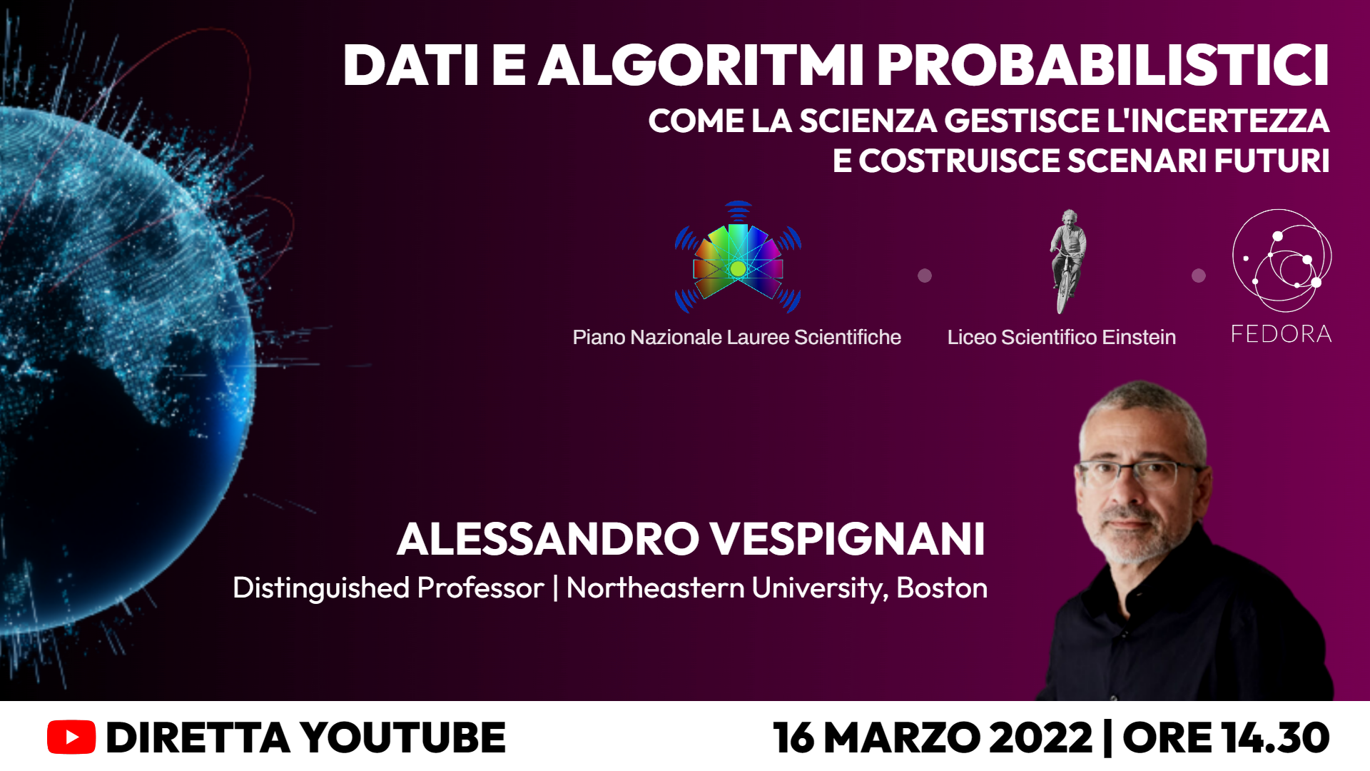 Il 16 marzo, a conclusione del laboratorio PLS sulla gestione dell’incertezza , il Liceo Einstein ha l’onore di ospitare il fisico Alessandro Vespignani, in collegamento online dalla Northeastern University di Boston. Il seminario verrà trasmesso in diretta per tutti gli interessati sul canale youtube del Liceo. I ragazzi di quarta iscritti al laboratorio seguiranno l’incontro in Aula Magna a partire dalle 14.30.