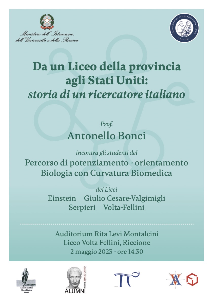 Martedì 2 maggio dalle 14:30 alle 16:30/17:00 presso l’Auditorium Rita Levi Montalcini del Liceo Volta Fellini di Riccione, gli studenti iscritti al Percorso di potenziamento e orientamento di Biologia con Curvatura Biomedica incontreranno il prof. Antonello Bonci, uno dei principali scienziati nel campo della Neuropsicofarmacologia (si veda circolare 423). L’incontro, dal titolo “Da un Liceo della provincia agli Stati Uniti: storia di un ricercatore italiano” è stato fortemente voluto ed organizzato dal Presidente dell’Ordine dei Medici, dott. Maurizio Grossi, per gli studenti dei licei di Rimini e Riccione che frequentano il Percorso di Biologia con curvatura biomedica.